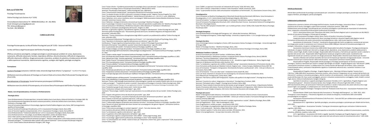 Sono la Dott.ssa Letizia Pini, psicologa psicoterapeuta, e svolgo consulenze psicologiche, supporto psicologico e psicoterapia, per intervenire su problemi di ansia, depressione, isolamento, difficoltà relazionali e familiari, dipendenze affettive, disagio psicosociale e lavorativo, problemi di autostima, problemi di elaborazione del lutto, deterioramento cognitivo. Sono laureata con lode in Psicologia, specializzata in Psicoterapia, e iscritta all’Ordine Psicologi del Lazio (N° 5159) - Sezione A dell’Albo, e nell’Elenco degli Psicoterapeuti dell’Ordine Psicologi del Lazio. Ricevo sia nel mio studio di Roma in zona Monteverde Gianicolense, sia online. Per una maggiore accessibilità alla terapia psicologica, applico tariffe professionali sostenibili e contenute. Aderisco al Bonus Psicologo, contributo per sostenere le spese per la psicoterapia per persone in situazione di disagio psicologico (domanda da presentare sul portale INPS www.inps.it).